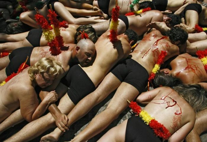 Fuimos 60 personas procedentes de diferentes zonas de España y de países de la UE, que con nuestros cuerpos yacentes y ensangrentados quisimos simbolizar así el sufrimiento que en estas fiestas tendrán decenas de animales que serán asesinados finalmente en la plaza.