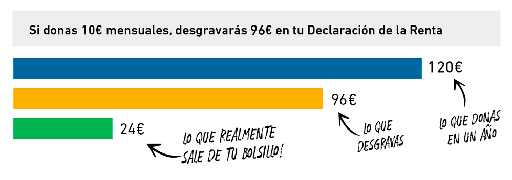 Las donaciones de hasta 250€ efectuadas por particulares desgravan un 80% en la Declaración del IRPF. A partir de los 250€, la cantidad restante desgrava un 40%.